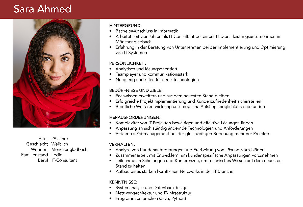 Persona-Profile: Erstelle detaillierte Persona-Profile, die Namen, Fotos und beschreibende Informationen enthalten. Beschreibe ihre Ziele, Motivationen, Verhaltensweisen und Herausforderungen. Je genauer und spezifischer deine Personas sind, desto besser kannst du die Gestaltung darauf abstimmen.