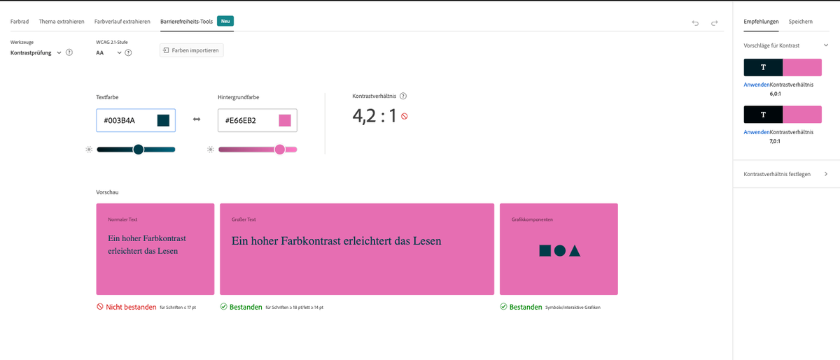 Eine weitere gute Möglichkeit sind Online-Tools wie Adobe Color. Bei Adobe Color kann man mithilfe verschiedener Farbschemata das richtige Design finden und es direkt auf das Kontrastverhältnis prüfen.