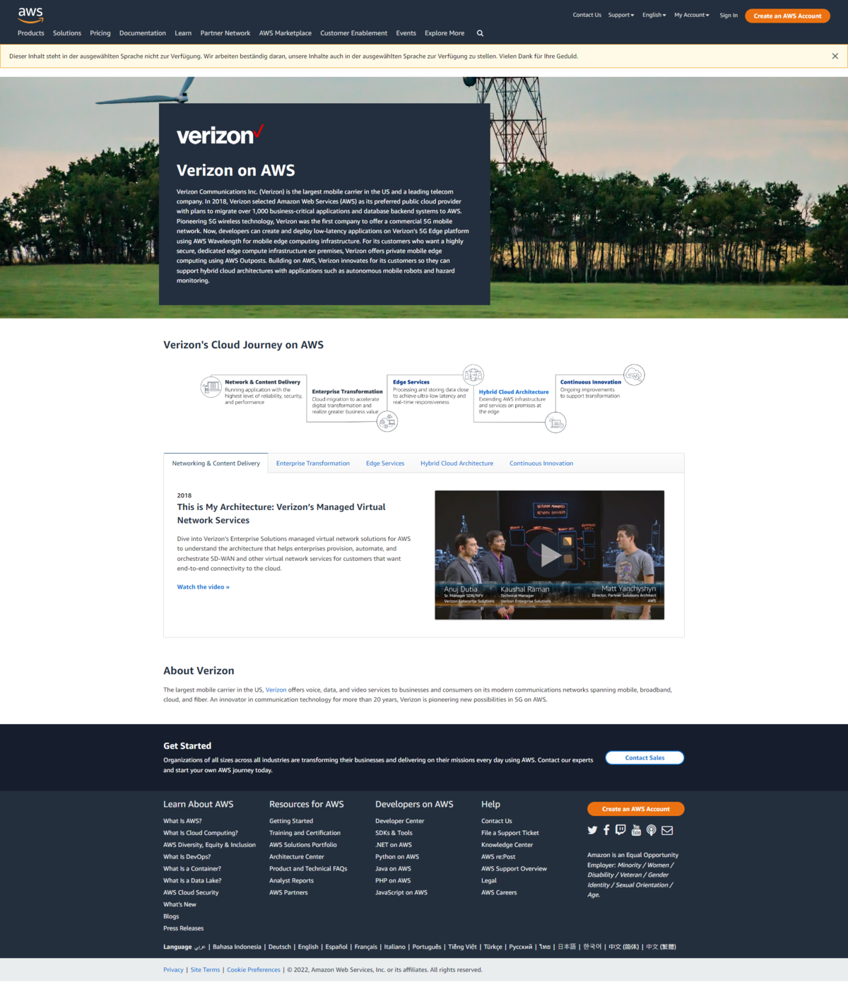 Recht textlastiger Einstieg, muss man so nicht machen. Allerdings gewinnen auch hier die multimedialen Inhalte. Insgesamt unterstützen 3 Videos die Success Story und erläutern ausführlich die gute Zusammenarbeit zwischen AWS und Verizon. Und das wirklich bis ins kleinste, technische Detail.